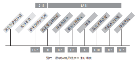 北仲曾于2021年8月25日制定并发布《紧急仲裁员决定自查清单》,其中附件1列举了紧急仲裁员程序审理时间表(见图六),以供紧急仲裁员在组织程序时参考。该审理时间表系以仲裁员为视角的程序安排,其中D1(DAY 1)为基准日,即指定紧急仲裁员的当日;D-2即指定紧急仲裁员的前2日,北仲应在当事人完成交费的2日内指定紧急仲裁员;D15即指定仲裁员的第15日,紧急仲裁员最迟应于该日作出紧急仲裁员决定。D1到D15之间则涵盖紧急仲裁员可能的各项程序安排,可资借鉴。