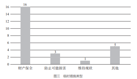 图三显示,就临时措施的类型而言,在前述25项临时措施申请事项中,16项属于财产保全,如冻结海外银行账户、禁止转让采矿权等;3项属于防止可能损害,如禁止相对方变更目标公司高管、禁止关联方的不当行为等;1项为维持现状;5项为其他类型,包括但不限于披露财产信息、向第三方披露决定内容、配合执行决定等。上述数据显示,财产保全是当事人最常使用的临时措施。可见,目前当事人申请临时措施的主要目的是防止相对人转移、处分财产等不当行为,以保障未来裁决的顺利执行。同时,结合临时措施被驳回的情况观察,很多非常规类型的临时措施或特别宽泛类型的临时措施,均不易得到仲裁庭或紧急仲裁员的支持。这也提醒当事人在提出临时措施时,要确保所提出的临时措施是明确、具体、可执行的。