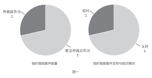 需要说明的是,在5个被支持的临时措施案件中,也并非当事人提出的全部临时措施申请事项均被支持。图二显示,如按照临时措施的申请数量统计,在7个案件中,当事人共提出25项临时措施申请,其中10项被支持,15项被驳回。驳回的原因包括但不限于临时措施不具有可行性、临时措施申请过于宽泛、临时措施针对案外第三人等。在前述25项临时措施申请事项中,仅有40%的事项获得支持,这与《ICC关于紧急仲裁员程序的报告》得出的结论相似,其实只有少数的紧急仲裁员和临时措施申请获得了最终的救济。但这本身也许并不令人惊讶:临时救济的性质就决定了只有在特殊情况下,紧急救济才是合理的。