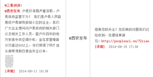 对此问题,8月15日下午,@西安发布 通过对话官微做出了回应:经西安户县环保局现场勘查,群众反映情况属实,户县御泉湾假日酒店存在噪声污染问题。户县环保局依照相关法律条文,于8月14日向该单位下达环境违法行为限期改正通知书,要求在15个工作日内办理环评审批手续,在未完成污染防治达标排放和通过环保部门验收前不得生产或使用产生噪音污染的设备。