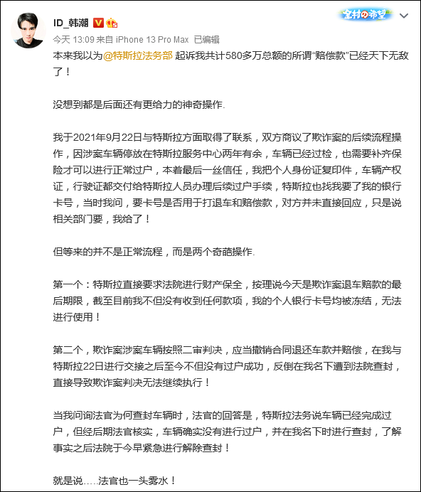 9月26日,韩潮在其个人微博透露,特斯拉近期以其侵犯其名誉权为由,将自己告上法庭,并要求公开赔礼道歉,合计索赔505万元。9月27日,韩潮又在微博上透露,他不仅未收到欺诈案退车赔款,自己的个人银行卡号也均被冻结,无法使用,他称这是特斯拉方面申请冻结的。