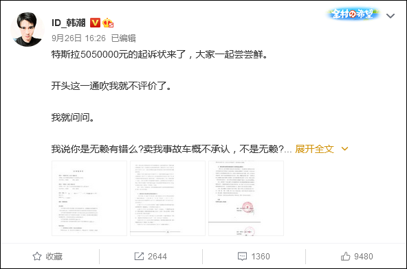9月26日,韩潮在个人微博发文称,特斯拉在此前案件中一审败诉和二审败诉后,近期又将自己告上了法庭,合计索赔505万元。