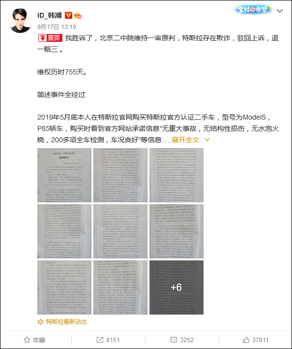 而在今年9月17日,维权车主韩潮在其微博透露,自己和特斯拉的官司二审结果已出,北京市第二中级人民法院宣布维持一审原判,认定特斯拉存在欺诈,退一赔三。此次判决为终审判决。