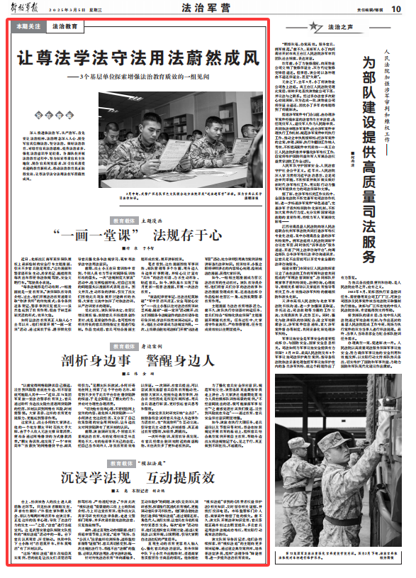 “廉洁纪律要牢记,违法违纪莫触碰”“军中禁酒风清正,安全驾驶心安宁”……战士小张以往对法治教育课缺乏兴趣,随着“一画一堂课”活动展开,战友们根据条令法规创作的法治标语令他印象深刻,学法积极性被调动起来。后来,他还主动申请成为法规宣传员。一次,上级联合驻地司法部门开展“送法进军营”活动,地方律师引用典型案例详细讲解各类法律知识。授课结束,小张立即将律师讲述的内容精心梳理,绘制成法治漫画,获得大家好评。