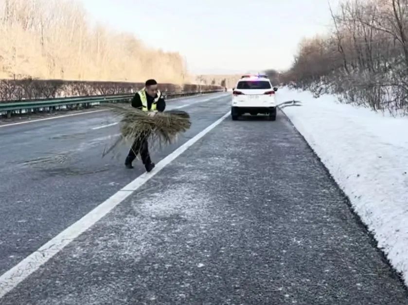 于是,民警快速将警车停靠在应急车道内,在做好现场安全防护后,对路面干草进行快速清理,消除道路安全隐患,确保辖区道路通行环境的安全畅通。