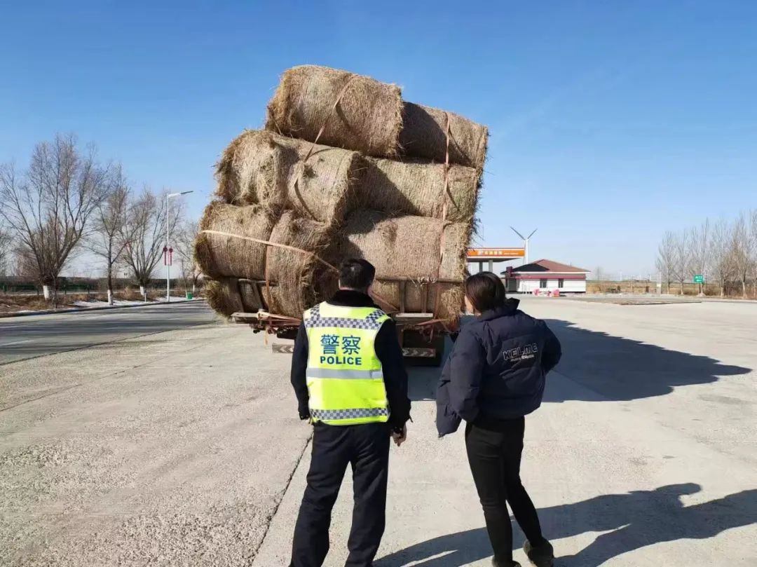 近日,白城分局巡逻一大队民警接到求助电话,在珲乌高速乌兰浩特方向765公里处驾驶人孙某驾驶的重型半挂牵引车装载的草捆发生倾斜,请求高速交警给予帮助。