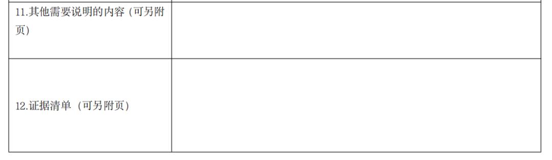 ➤ 要点4:除了以上内容,若有其他需要说明的内容或证据清单需要提交,可另行附页说明。如有您认为与案件无关的项目,也可以填“无”或不填。