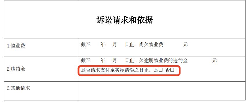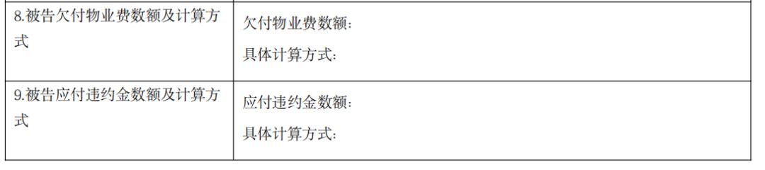 ➤ 要点2:表格第8.9项,写明被告欠付物业费和应付违约金的具体金额和计算方式。