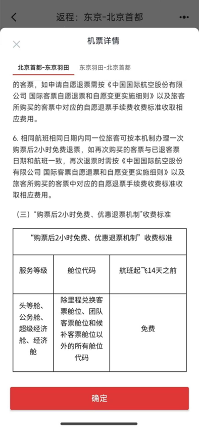 其中,中国国际航空公司的官方APP显示,购票后2小时内退票,除里程兑换客票舱位、团队客票舱位和候补客票舱位以外所有的舱位代码(含头等舱、公务舱、超级经济舱、经济舱),航班起飞14天之前,均免收退票手续费。如出票后超过2小时(不含)申请退票或出票时航班起飞在14天(不含)之内的,适用《中国国际航空股份有限公司 国家客票自愿退票变更实施细则》以及旅客所购买的客票对应的自愿退票手续费收费标准。
