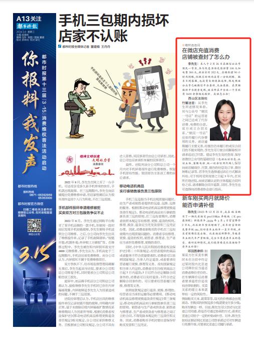 西山区法院杜竹馨法官:从李先生所述情况来看,其与公众号的运营者之间已达成了代存话费、电费的合意,双方成立合同关系,该公众号应依约履行代存费用的义务。该店逾期履行主要义务,经催告仍未履行的或至合同目的不能实现的,李先生可行使合同解除权并请求返还已付款。建议李先生及时查询、保存该微信公众号的基础信息(包括认证信息:认证主体、客服电话、统一社会信用代码),保存向该店铺询价、付款、催告的信息及订单、微信转账记录等。若李先生选择通过诉讼方式解决纠纷,可于权利受到侵害之日起3年内,在其所在地法院,向该店铺认证的主体提起合同纠纷之诉,请求解除合同并退款。同时,李先生也可选择向消费者协会进行投诉。