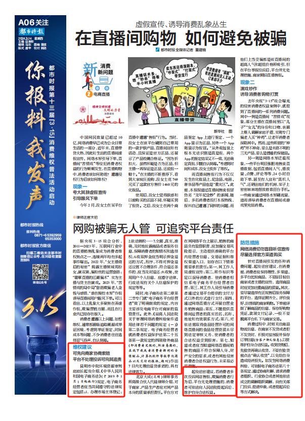针对直播间引发的各种消费问题,昆明中院环资庭庭长起俊建议,在消费前,消费者应保持理性,多渠道、多平台比较商品,不要盲目轻信商家或者主播的宣传,选择商品时应更加注重商品的质量。其次,要尽量选择有正规售后服务保障的平台,选择证照齐全、评价良好、信誉高的商家购物。下单前详细了解商品的信息,保存好购物凭证、款项支付记录,一般不要脱离平台私下与商家交易。