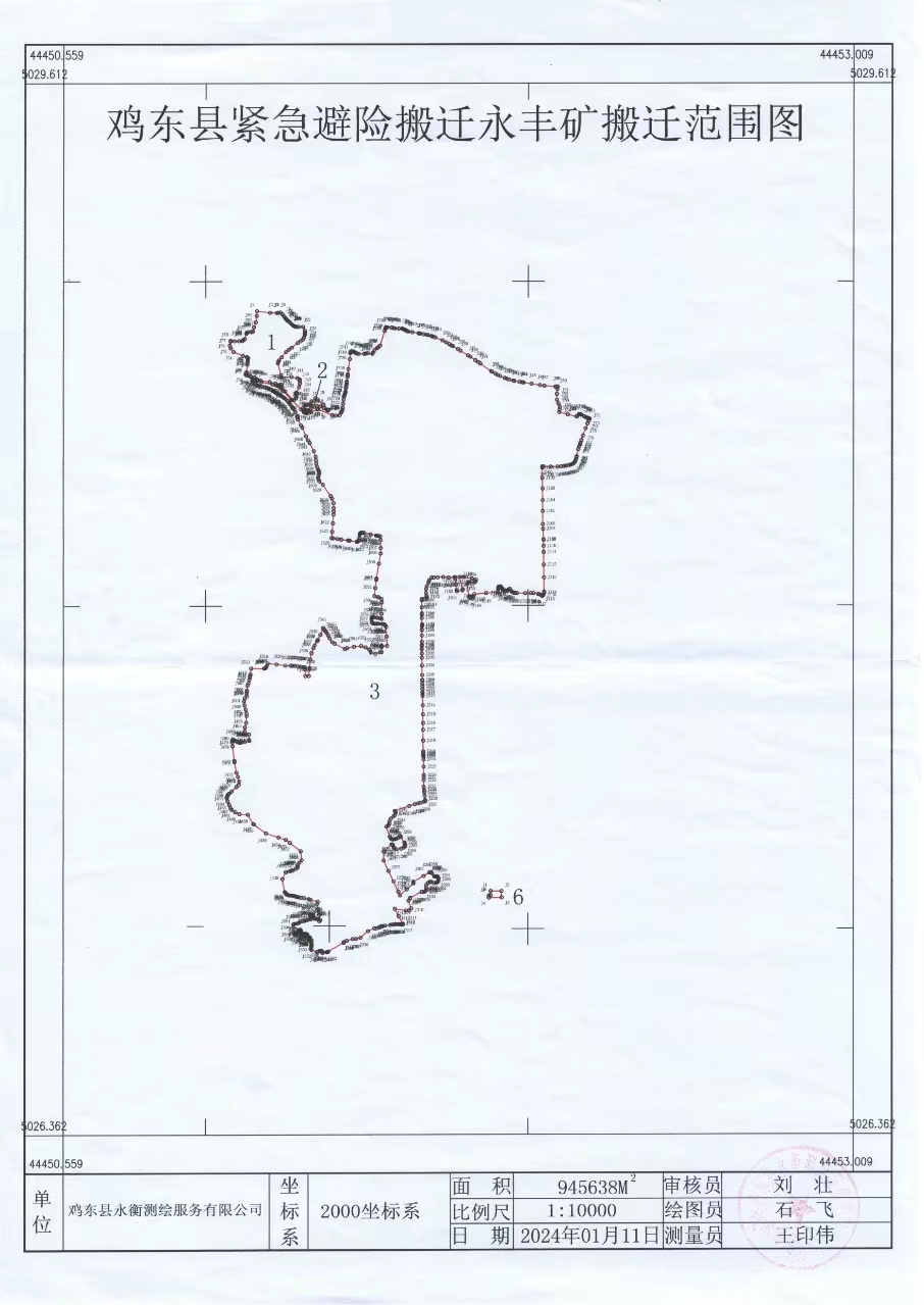 东至永丰村耕地;南至永丰矿变电所;北至永丰村稻田地排水豪;西至永丰村耕地,安置户数391户。(附鸡东县紧急避险永丰煤矿搬迁范围图及坐标)