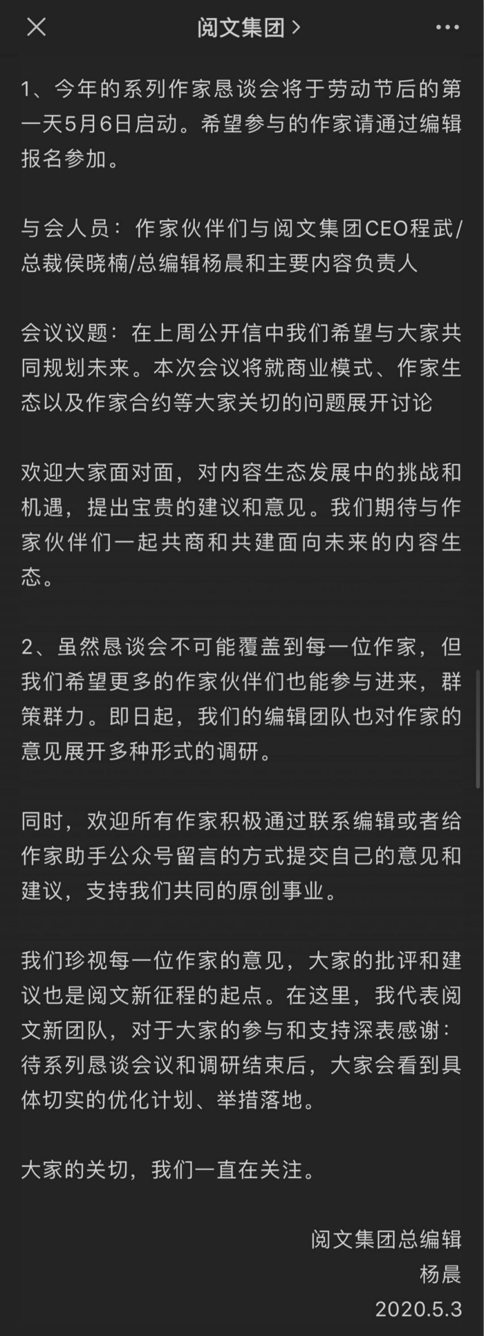 5月3日,阅文集团通过官方公众号发布《关于阅文作家系列恳谈会和调研的安排》,表示将于五一劳动节结束后第一天,也就是5月6举办系列作家恳谈会,新上任的阅文集团CEO程武、总裁侯晓楠、总编辑杨晨等人及作家代表们都将出席。会议讨论主题,“将就商业模式、作家生态以及作家合约等大家关切的问题展开讨论”。