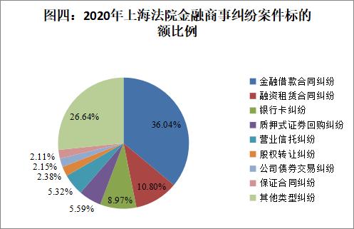 从案件标的金额来看,2020年上海法院受理一审金融商事案件标的总额为人民币1806.04亿元,同比下降18.58%。案件标的额居前三位的案件类型为金融借款合同纠纷、融资租赁合同纠纷、银行卡纠纷。