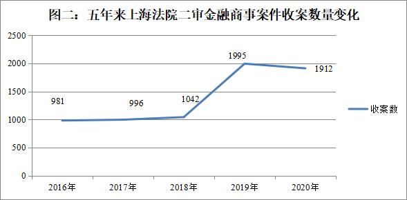 2020年,全市法院共受理二审金融商事案件1,912件,同比下降4.16%(图二),审结二审案件1,912件。