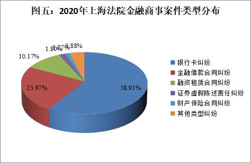 从案件类型来看,2020年上海法院收案数量排名前五的金融商事案件类型是银行卡纠纷、金融借款合同纠纷、融资租赁合同纠纷、证券虚假陈述责任纠纷和财产保险合同纠纷,这五类案件占金融商事案件总数的96.12%。