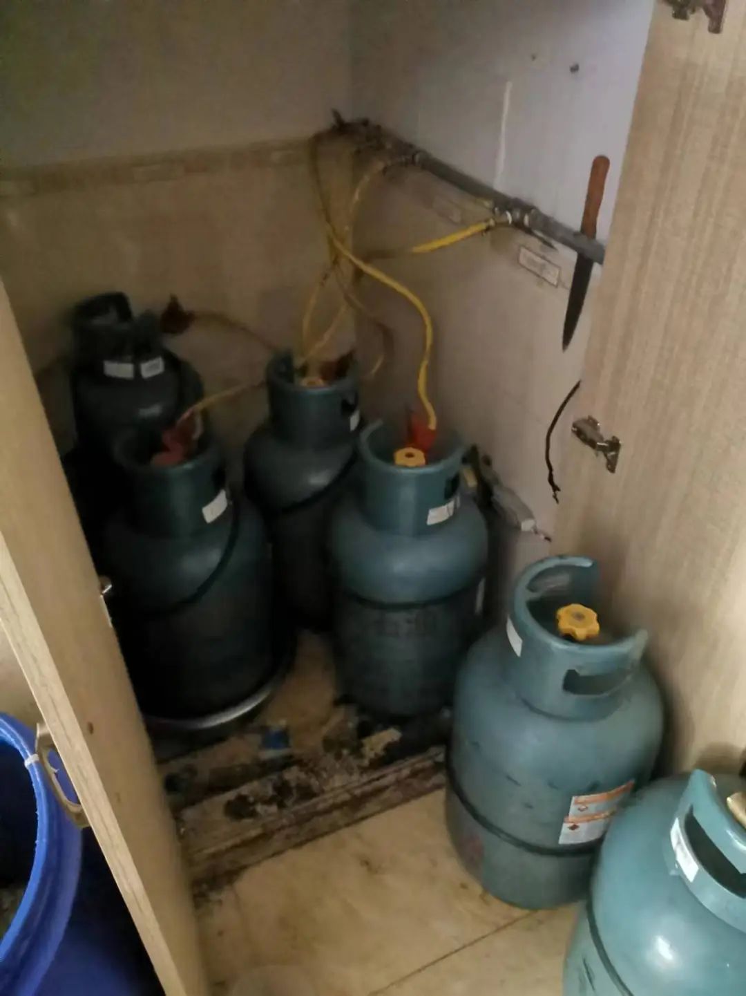 存在隐患:液化石油气钢瓶未设置独立的储瓶间,未与经营区域做有效防火分隔