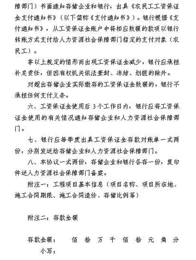第九条 存储工资保证金的施工总承包单位应与经办银行签订《农民工工资保证金存款协议书》(附件1),并将协议书副本送属地人力资源社会保障行政部门备案。