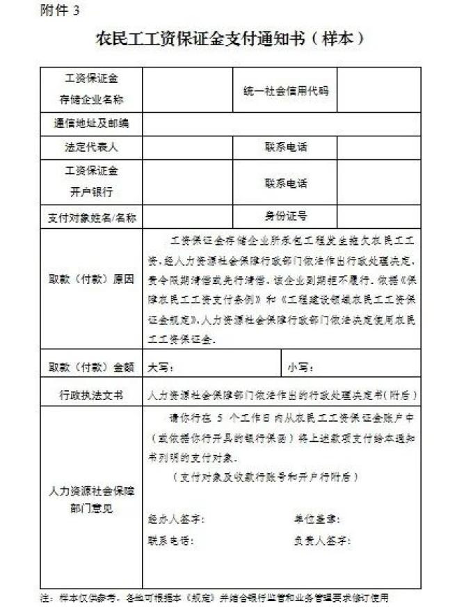 第十九条 施工总承包单位所承包工程发生拖欠农民工工资的,经人力资源社会保障行政部门依法作出责令限期清偿或先行清偿的行政处理决定,施工总承包单位到期拒不履行的,属地人力资源社会保障行政部门可以向经办银行出具《农民工工资保证金支付通知书》(附件3,以下简称《支付通知书》),书面通知有关施工总承包单位和经办银行。经办银行应在收到《支付通知书》5个工作日内,从工资保证金账户中将相应数额的款项以银行转账方式支付给属地人力资源社会保障行政部门指定的被拖欠工资农民工本人。