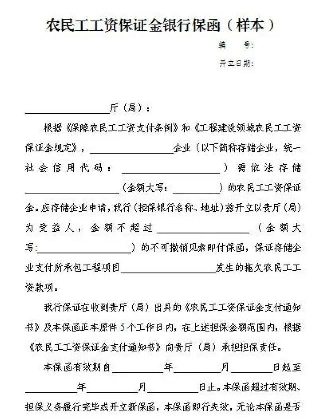 工资保证金可以用银行类金融机构出具的银行保函替代,有条件的地区还可探索引入工程担保公司保函或工程保证保险。