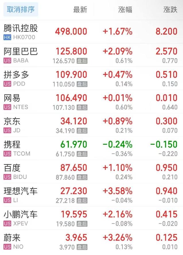 热门中概股方面,腾讯控股(港股)涨1.67%,阿里巴巴涨2.09%,拼多多涨0.47%,网易涨0.01%,携程跌0.24%,百度涨1.10%,理想汽车涨3.58%,小鹏汽车涨2.16%,蔚来涨3.26%。
