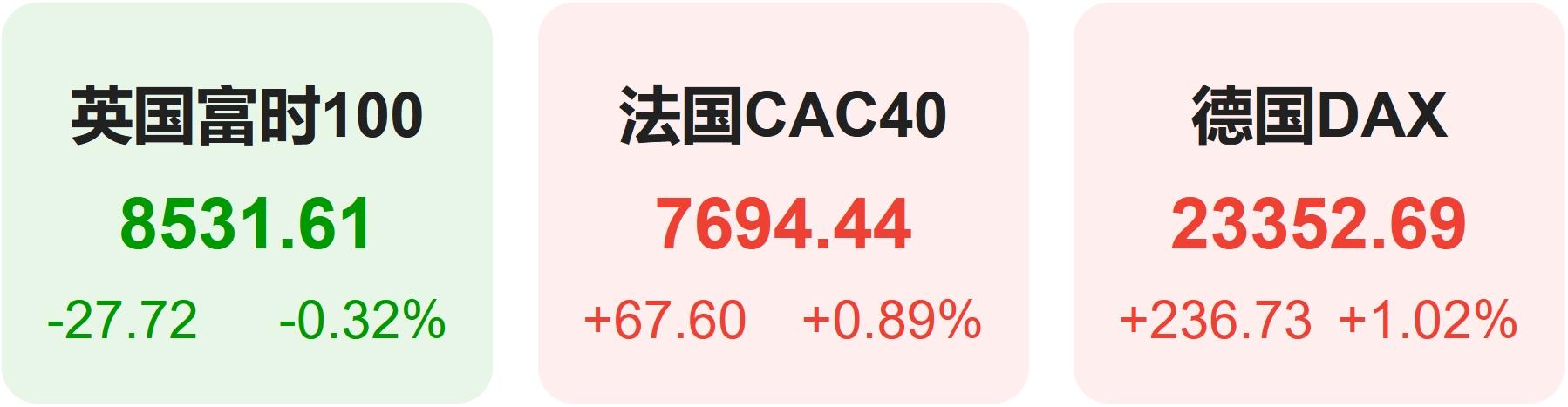 欧洲股市方面,英国富时100指数小幅下跌0.32%,报8532点。法国CAC40指数小幅上涨0.89%,报7694点。德国DAX指数上涨1.02%,报23353点。