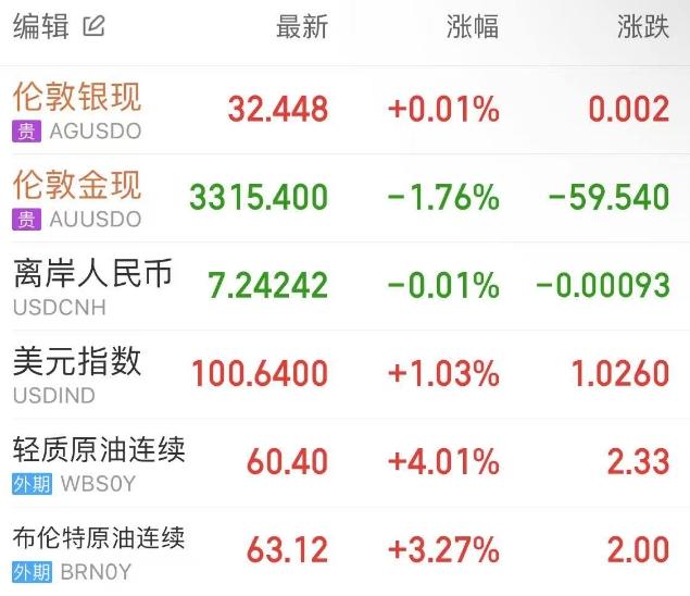 现货黄金一度下触3290美元,伦敦金最终收跌1.77%,报3315美元/盎司;伦敦银几乎平收,报32.458美元/盎司。
