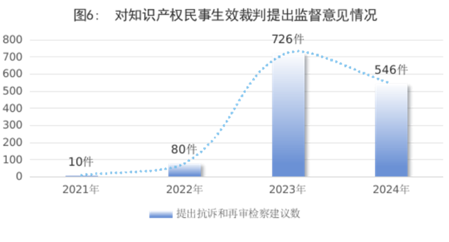 1.民事生效裁判监督有序推进。对知识产权民事生效裁判提出抗诉94件,同比增加2.5倍;提出再审检察建议452件。法院再审后改变482件,占法院审结案件数的97.2%。