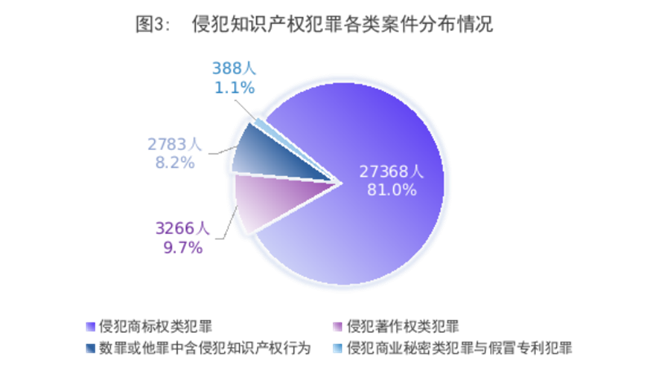 2.刑事案件类型相对集中。受理审查起诉侵犯商标权类犯罪27368人,占知识产权刑事案件人数的81%,2020年至2024年年均增长18.8%;受理审查起诉侵犯著作权类犯罪3266人,占比9.7%,2020年至2024年年均增长43.5%;受理审查起诉侵犯商业秘密类犯罪385人;受理审查起诉假冒专利犯罪3人;受理审查起诉数罪或者他罪中含侵犯知识产权行为2783人,占比8.2%。