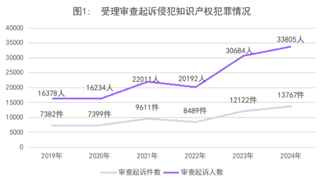 2024年,各级检察机关认真落实全国检察机关刑事检察工作会议精神,依法打击侵犯知识产权犯罪行为,共受理审查逮捕侵犯知识产权犯罪7646件13486人,受理审查起诉13767件33805人;批准逮捕4691件7481人,不批准逮捕2914件5881人;起诉9452件20817人,不起诉1929件5754人;不捕率、不诉率分别为44%、21.7%。