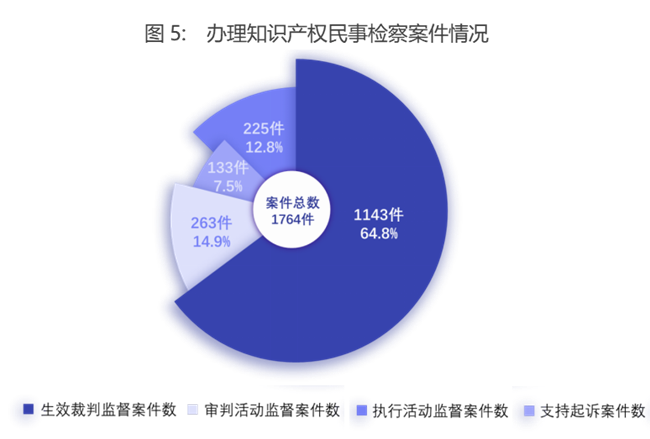2024年,全国检察机关共办理知识产权民事检察案件1764件,其中民事生效裁判监督1143件,民事审判活动监督263件,民事执行活动监督225件,民事支持起诉133件。