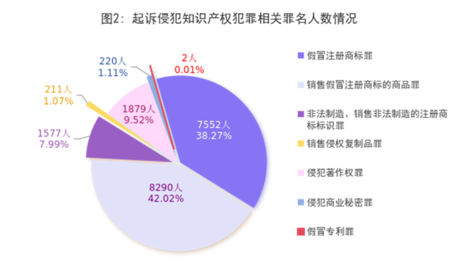 1.不断加大犯罪打击力度。受理审查逮捕、审查起诉侵犯知识产权犯罪人数同比分别上升5.9%、10.2%,批准逮捕、起诉侵犯知识产权犯罪人数同比分别上升23.2%、17.4%。其中,假冒注册商标罪批准逮捕1796件2933人,起诉3520件7554人;销售假冒注册商标的商品罪批准逮捕1959件2962人,起诉3841件8290人;非法制造、销售非法制造的注册商标标识罪批准逮捕279件425人,起诉574件1577人;侵犯著作权罪批准逮捕336件539人,起诉860件1879人;销售侵权复制品罪批准逮捕45件58人,起诉94件211人;侵犯商业秘密罪批准逮捕72件131人,起诉91件220人;假冒专利罪起诉1件2人。