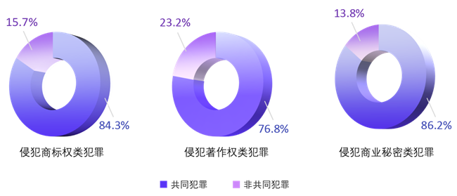 3.共同犯罪特征明显。起诉侵犯商标权类犯罪的17421人中,共同犯罪14687人,占比84.3%;起诉侵犯著作权类犯罪的2090人中,共同犯罪1606人,占比76.8%;起诉侵犯商业秘密类犯罪的225人中,共同犯罪194人,占比86.2%。