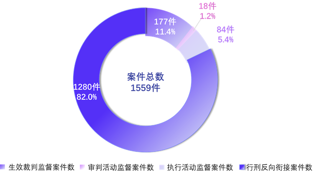 2024年,全国检察机关共办理知识产权行政检察案件1559件。其中,行政生效裁判监督案件177件,同比上升16.4%;行政审判活动监督案件18件;行政执行活动监督案件84件;通过行刑反向衔接提出检察意见1280件。