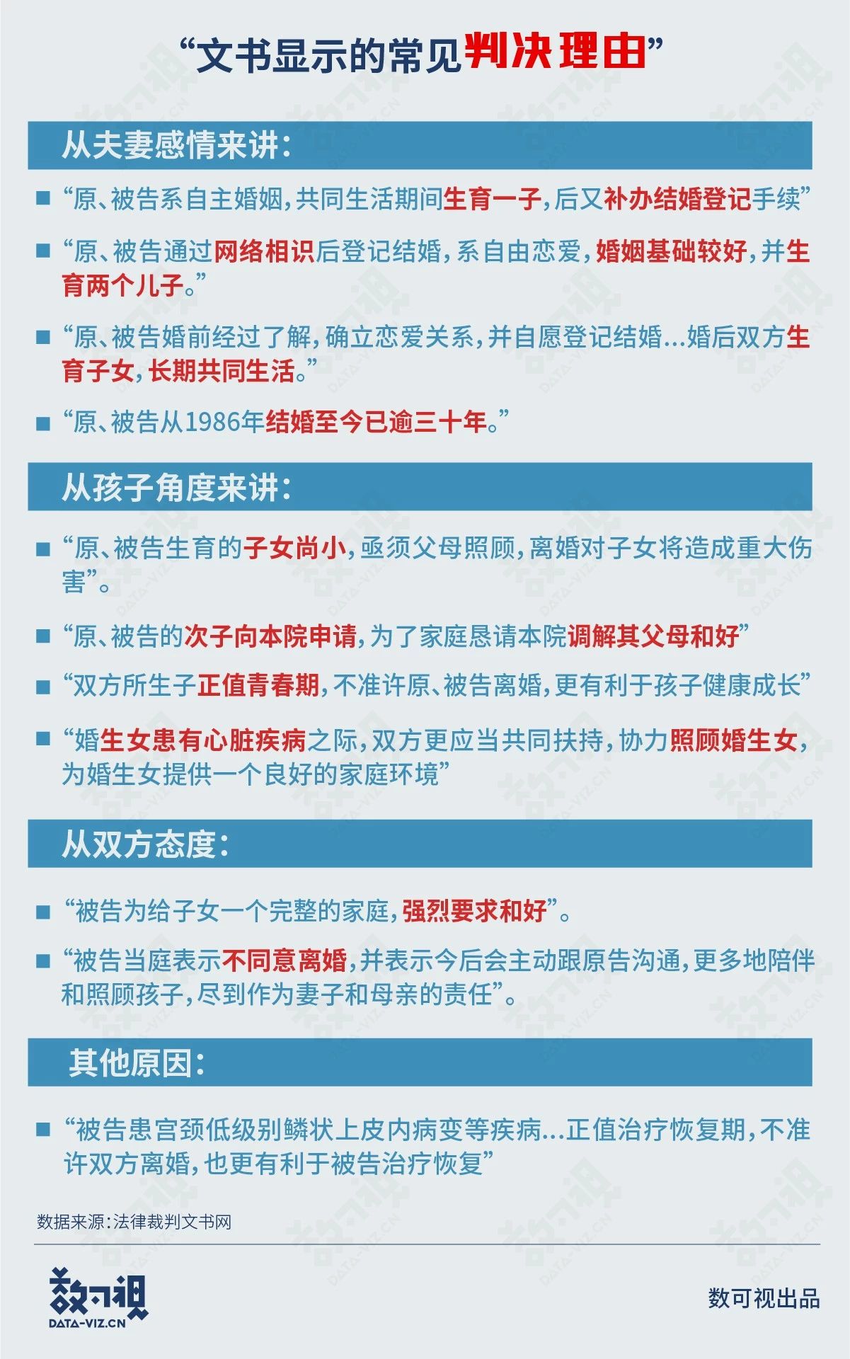 而认定出轨后,判定离婚的比例也并不算高,仍有40.3%不会被判决离婚。法院常见的判决理由如下: