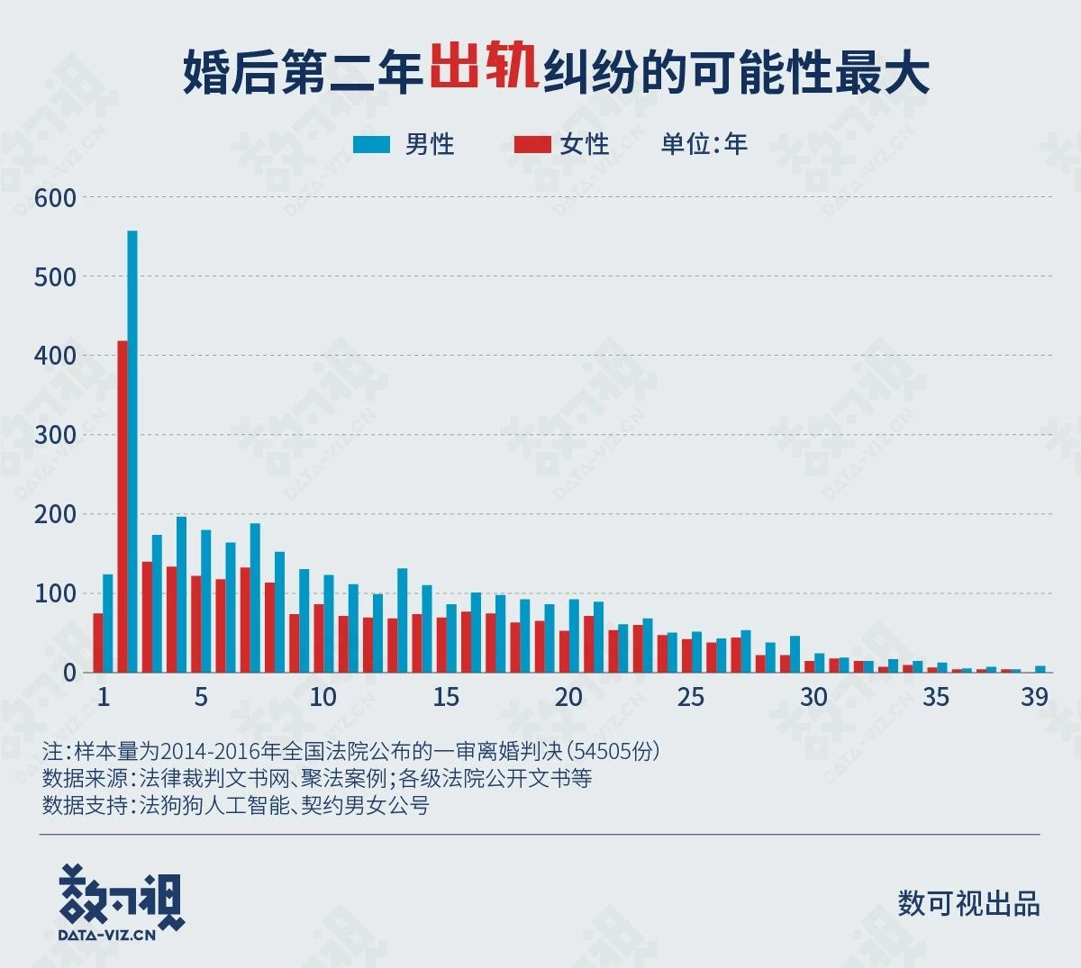 根据出轨纠纷案件显示,结婚第二年出轨闹离婚的比例最大,达到15%,远高于其它婚龄的数据。可能度过1年的甜蜜期后,现实的茶米油盐使得彼此矛盾加剧,促使双方出轨的可能性增加;同时,女性在第二年怀孕的可能性较大,男性在外寻求性满足的概率变大。