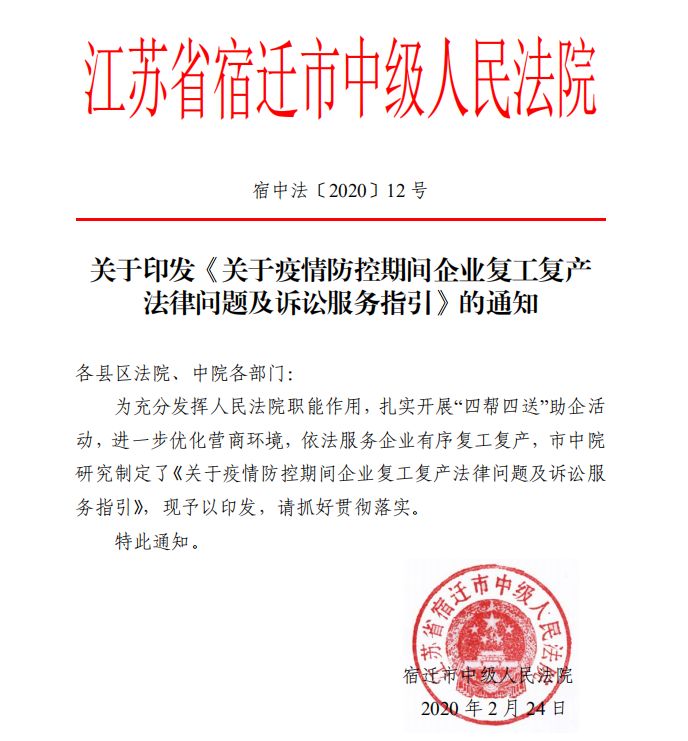 为充分发挥人民法院职能作用,扎实开展“四帮四送”助企活动,依法服务企业有序复工复产,2月24日,宿迁中院印发《疫情防控期间企业复工复产相关法律问题和诉讼服务指引》。针对企业复工复产可能面临的法律问题和困难,就法院诉讼服务、企业合同履行、企业公司治理、企业劳动用工、企业执行提示、涉“疫”行政法律提示、涉“疫”刑事法律提示七大方面的45个问题作出详细解答,为企业有序复工复产保驾护航。