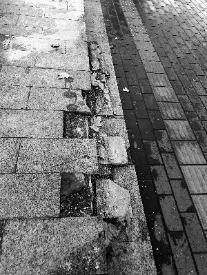 有现场居民告诉记者,入秋时,小广场周围就出现了这种情况,“居民区老人孩子不少,确实担心他们一不留神就磕着碰着。除了台阶问题,这地面也不平整,小孩子滑个轮滑过去,一路咕噜咕噜地响动,地砖都松了,也不知道什么时候能修好。”顺着居民所指的方向望去,记者看到广场中央位置也有约10平方米的下沉,七扭八歪的路砖看上去并不牢靠,路人都绕行此处。