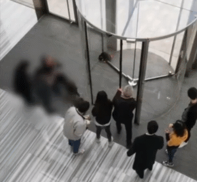 今年1月,一名女子不牵绳带狗进写字楼导致狗狗被旋转门死死卡住,急得狗主人坐地嘶嚎求救,最终物业不得不砸门救狗……