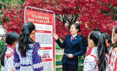 近年来,各地持续深化法治宣传教育,增强全民法治观念,助力法治中国建设。图为2024年12月3日,贵州省黔西市人民检察院干警在新仁苗族乡化竹小学为学生普及宪法知识。新华社发 范晖/摄