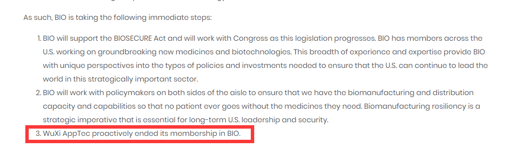 主动退出是为了让BIO能够与政策制定者更有效沟通在上述BIO披露的新闻稿中,药明康德“主动”终止了其在BIO的会员资格这一行为同样值得关注。