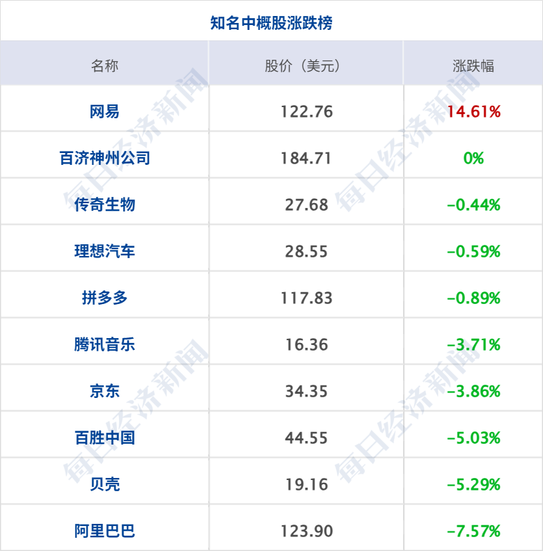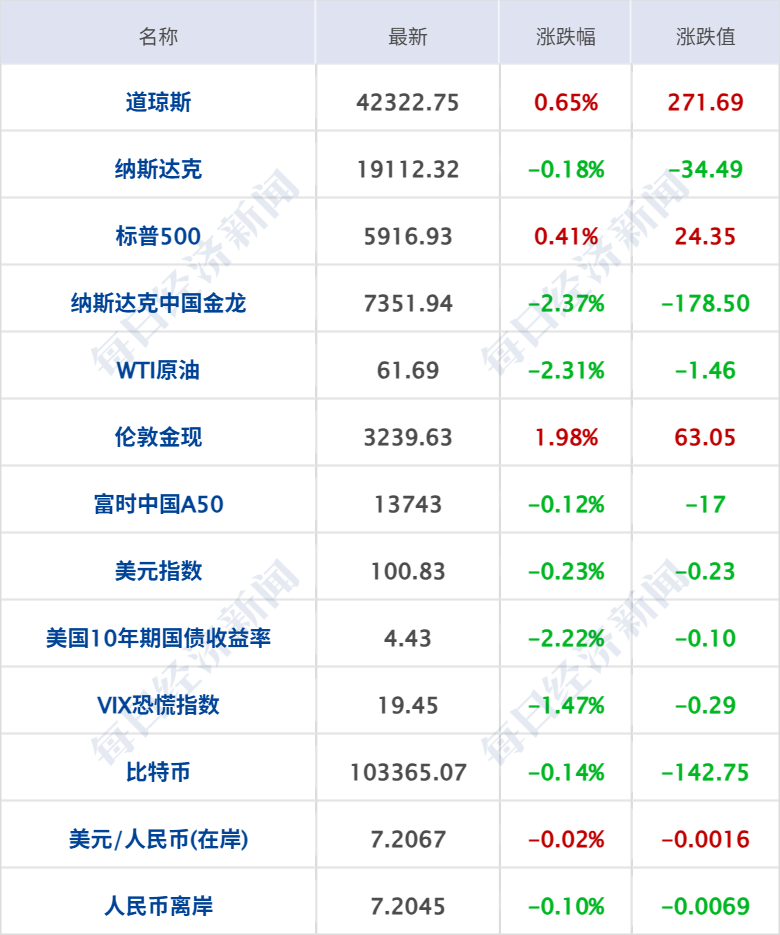 美股三大指数收盘涨跌不一,道指涨0.65%,标普500指数涨0.41%,纳指跌0.18%;大型科技股多数下跌,亚马逊、Meta跌超2%,特斯拉跌超1%,苹果、英伟达、谷歌小幅下跌;奈飞涨超2%,微软、英特尔小幅上涨。中概股多数下跌,纳斯达克中国金龙指数跌2.37%;老虎证券跌超8%,阿里巴巴、文远知行跌逾7%,富途控股跌超5%,京东、百度、蔚来跌逾3%;网易涨超14%,股价逼近历史新高。