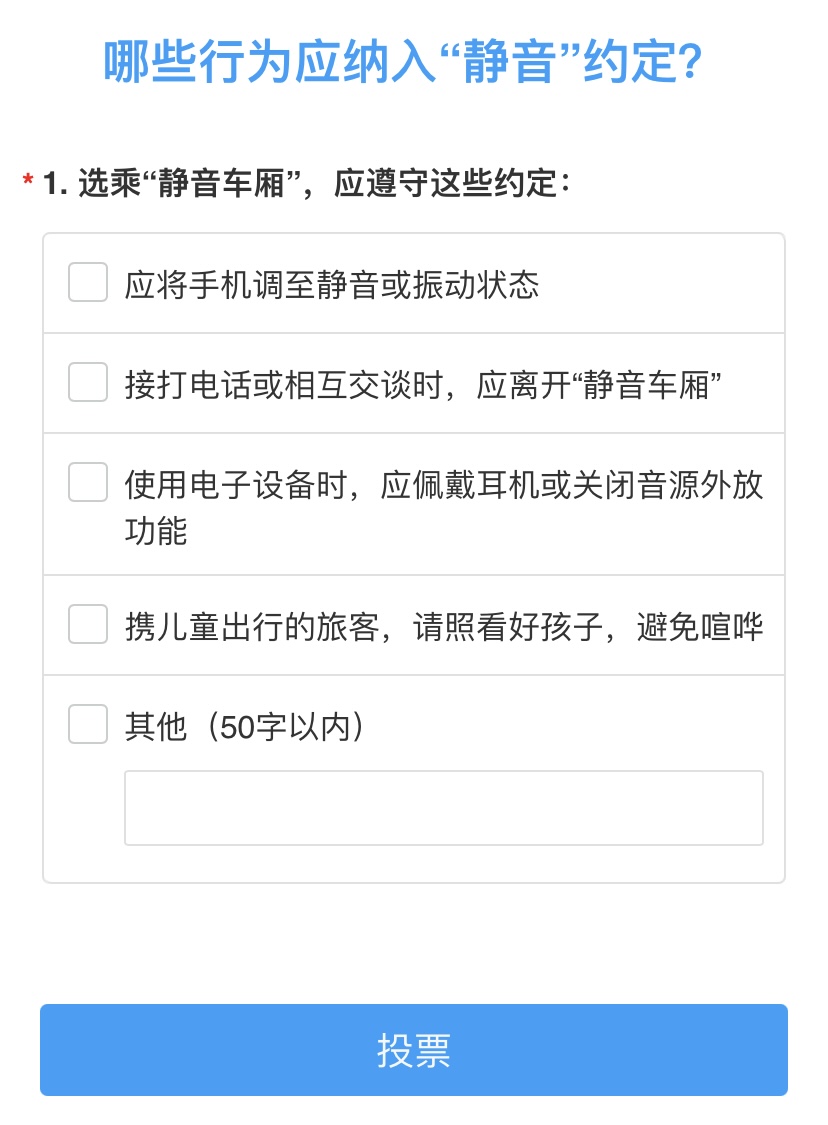 微博投票给出以下5个选项:应将手机调至静音或振动状态;接打电话或相互交谈时,应离开“静音车厢”;使用电子设备时,应佩戴耳机或关闭音源外放功能;携儿童出行的旅客,请照看好孩子,避免喧哗;其他。投票时间为2020年11月25日-30日。