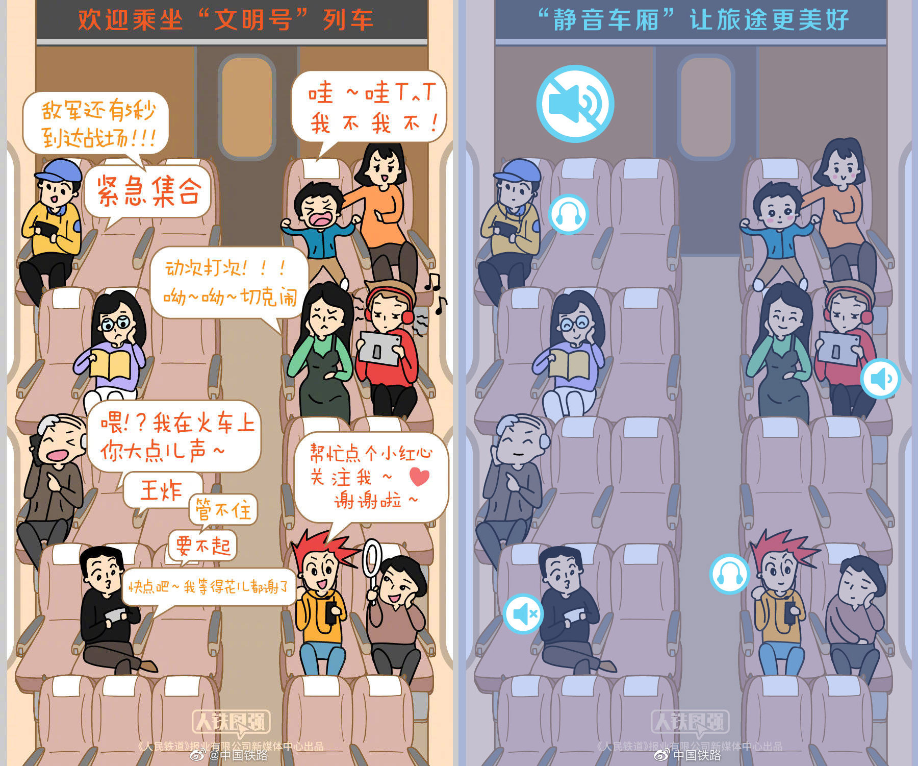 11月25日,中国国家铁路集团有限公司官方微博“中国铁路”称,铁路部门将在京沪高铁、成渝高铁部分复兴号动车组试点设置“静音车厢”,并发起高铁“静音车厢”投票,邀请网友对车厢约定提出意见。
