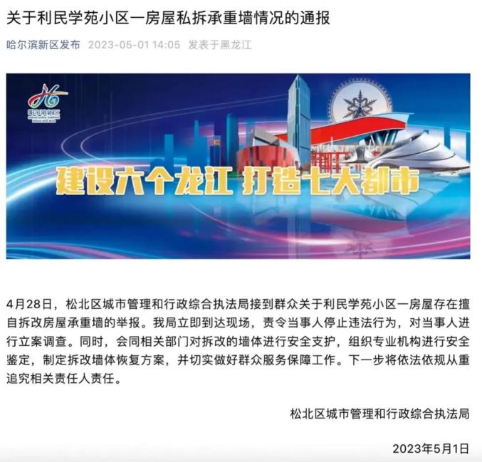 北京岳成律师事务所岳屾山律师表示,针对“哈尔滨居民楼承重墙被砸”事件,根据目前公布的信息,责任人有租户和实施拆除的施工单位,如果业主也知情,需要共同承担上述责任。