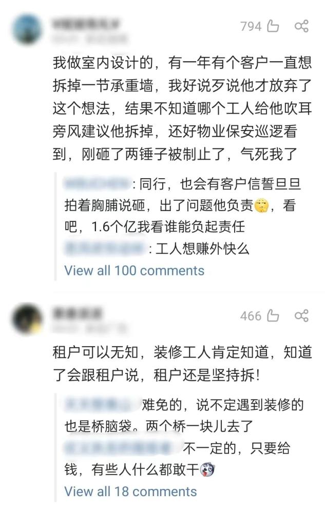 网友们议论纷纷,有装修行业从业者说出自己曾经“劝阻业主拆承重墙”的经历,还有网友提出装修工人是专业人士应该提醒!
