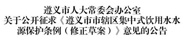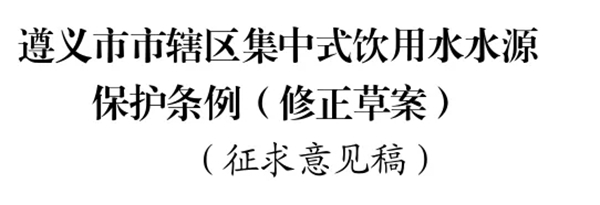 根据《遵义市人大常委会2025年工作要点》安排,市人大常委会修法起草组在实地调研、征求各级各有关部门及有关基层立法联系点意见建议的基础上,梳理形成了《遵义市市辖区集中式饮用水水源保护条例(修正草案)》(征求意见稿)。为进一步做好法规修正工作,现就条例(修订草案)向社会公开征求意见。