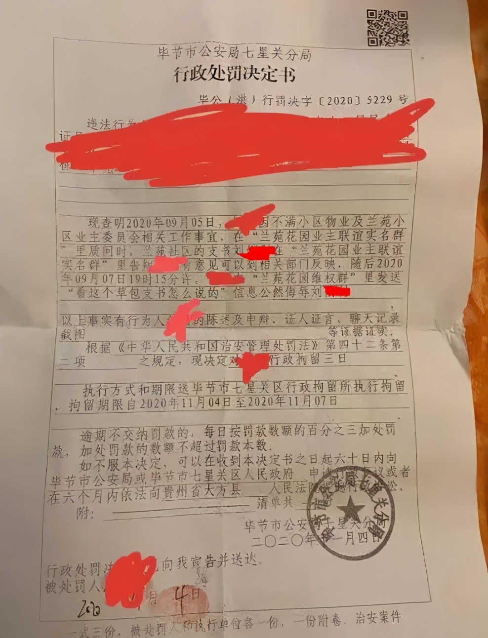 由其提供的一份《毕节市公安局七星关分局行政处罚决定书》可以看到,11月4日,她因2020年9月7日19时15分许,在兰苑花园维权群里发送“看这个草包支书是怎么说的”信息公然侮辱刘某,根据《治安管理处罚法》第四十二条第二项之规定,被毕节市公安局七星关分局决定行政拘留三日。(澎湃新闻)