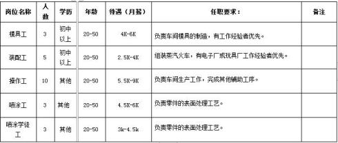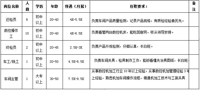 公司是一家专业从事机械加工,集设计、生产、组装、销售和服务于一体的发展中生产和销售厂家。拥有多台精密机加工设备和检测设备,公司主要业务为汽车零配件及其它小型镁铝合金、球墨铸铁件的加工与工装夹治具、检具等设计加工。现因公司业务发展的需要,特招聘以下人员: