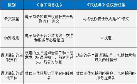 此外,《民法典》中规定的知识产权的网络侵权责任规则也是一大亮点,该规则是对《侵权责任法》《电子商务法》《消费者权益保护法》的借鉴完善,是民法典侵权责任编规定的网络侵权责任的特别法。[2]“电子商务知识产权侵权责任”虽由《电子商务法》规定,但其实是“网络侵权责任”的下属概念,两者的规定在主要部分基本相似,存在的区别是: